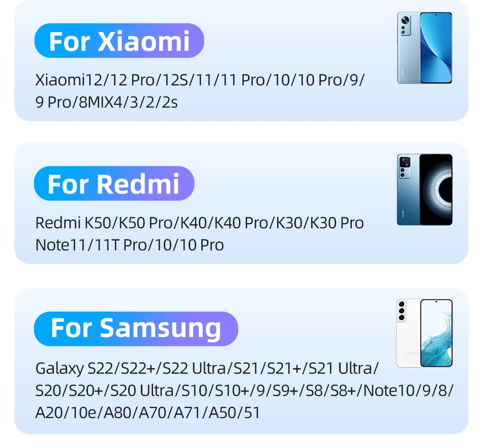 | Compatibility 2 | For Xiaomi mi 12 11 10 9 8 Pro Redmi K50 K40 K30 Pro Note 11 10 Pro |