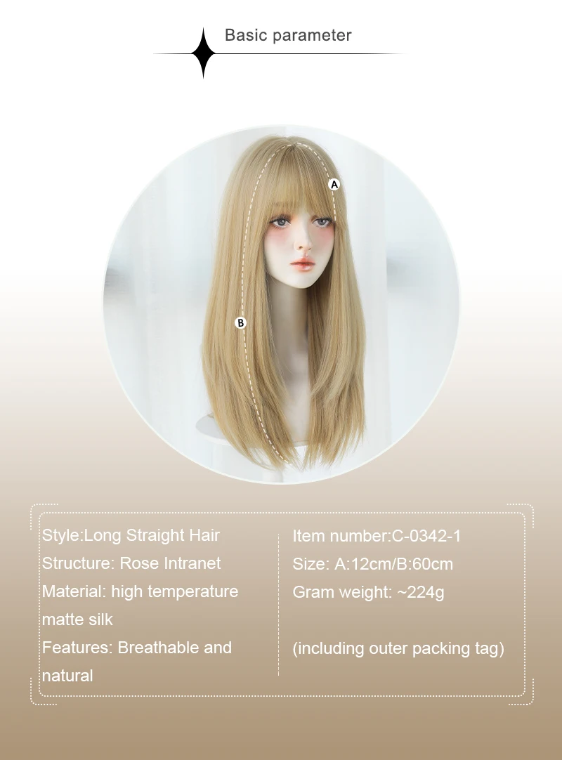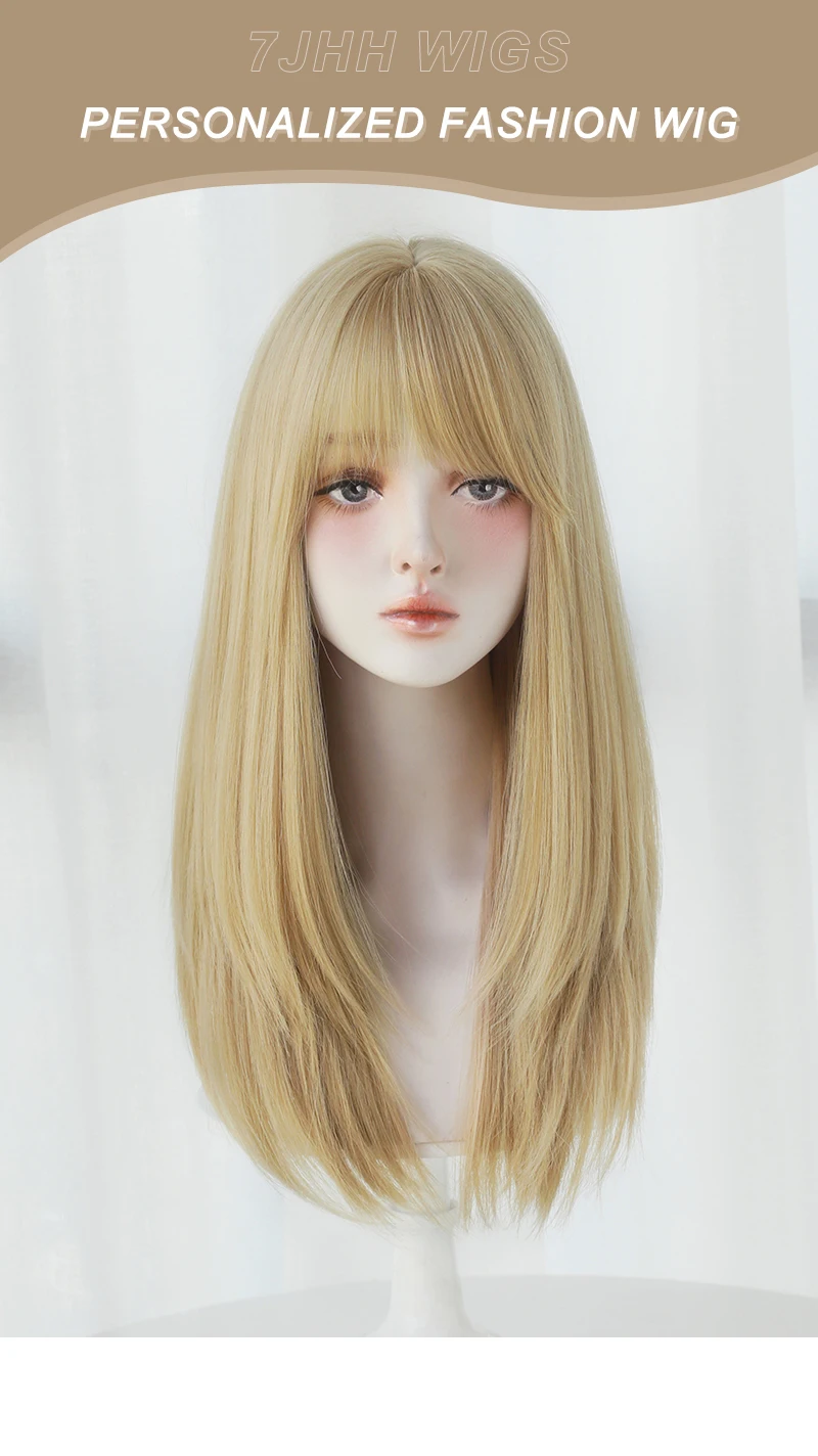 Name:7JHH WIGS Straight Layered Blonde Wigs with Neat Bangs High Density Synthetic Natural Fake Hair Wig for Women Daily Cosplay Party Wigs