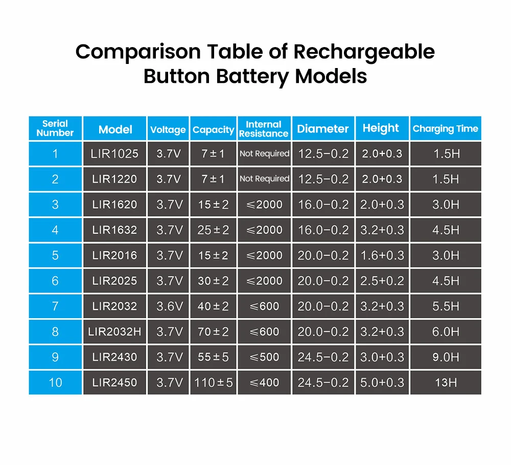 Suitable Rechargeable Battery Models: LIR1025、LIR1220、LIR1254、LIR1620、LIR1632、LIR2016、LIR2025、LIR2032、LIR2430、LIR2450;
