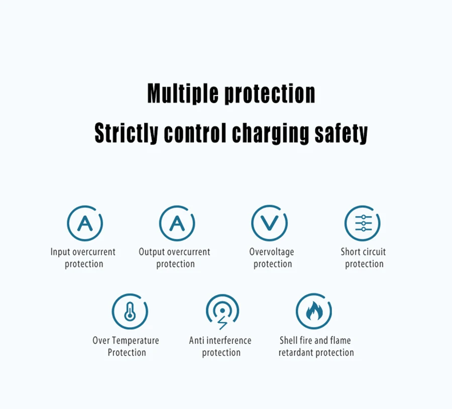 Current overload protection, voltage overload protection, short circuit protection, ultra-high temperature protection, shell flame retardant protection