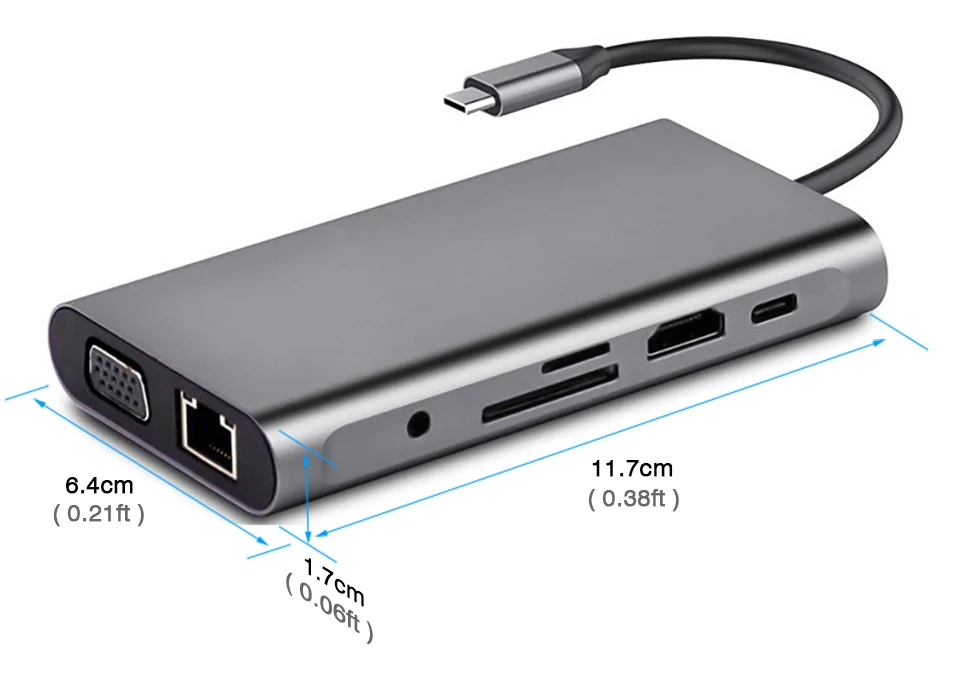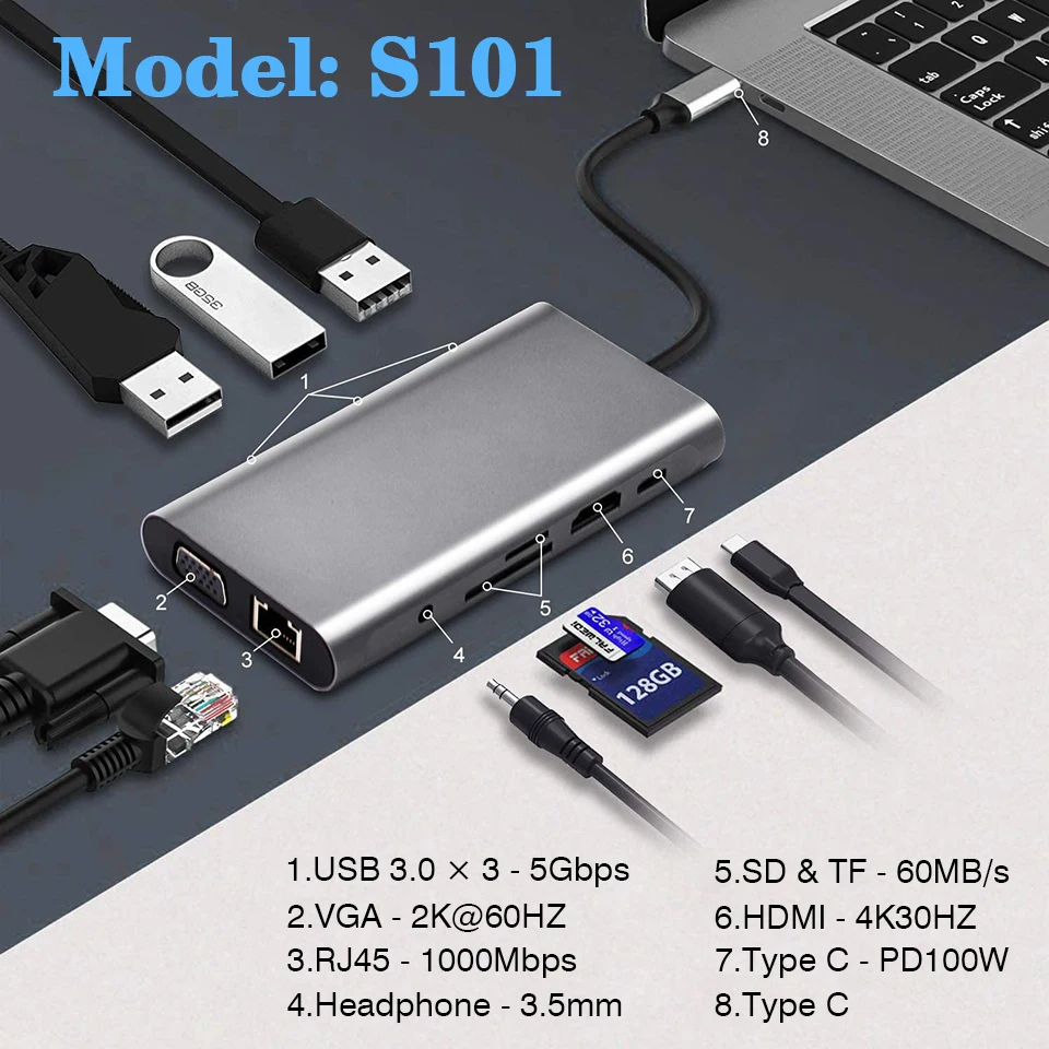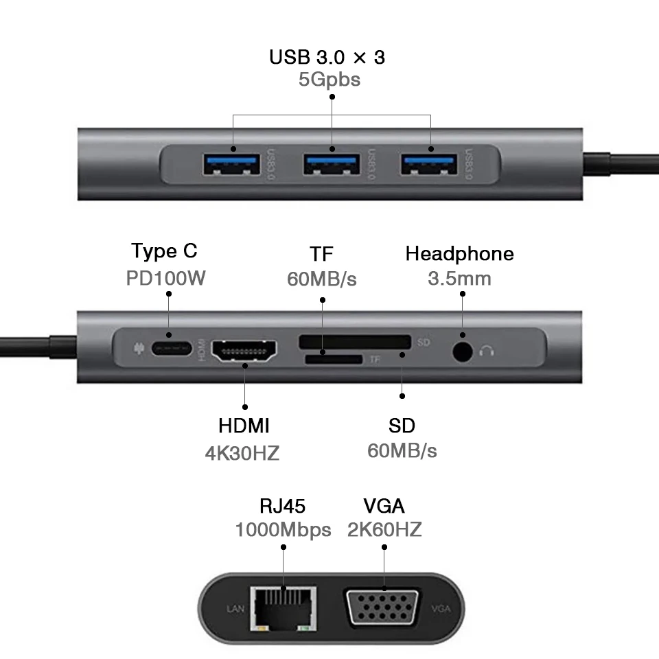 c to rj45 Gigabit,VGA 2K@60HZ,HDMI 4k@30hz,usb3.0,PD 100w fast charge,sd,tf Card Reader,Headphone 3.5mm