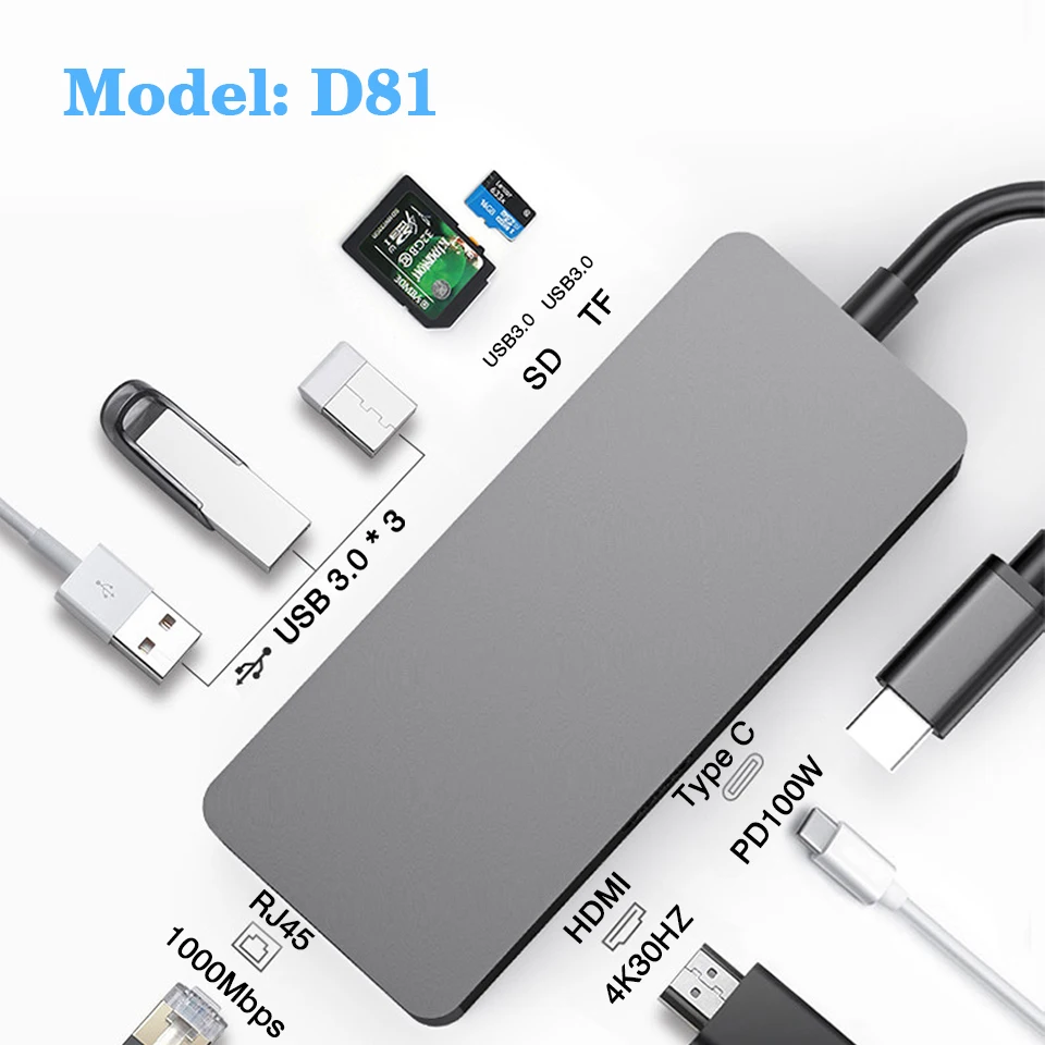 c to rj45 1000mbps,HDMI 4k30hz,usb3.0,pd100w,sd,tf Card Reader